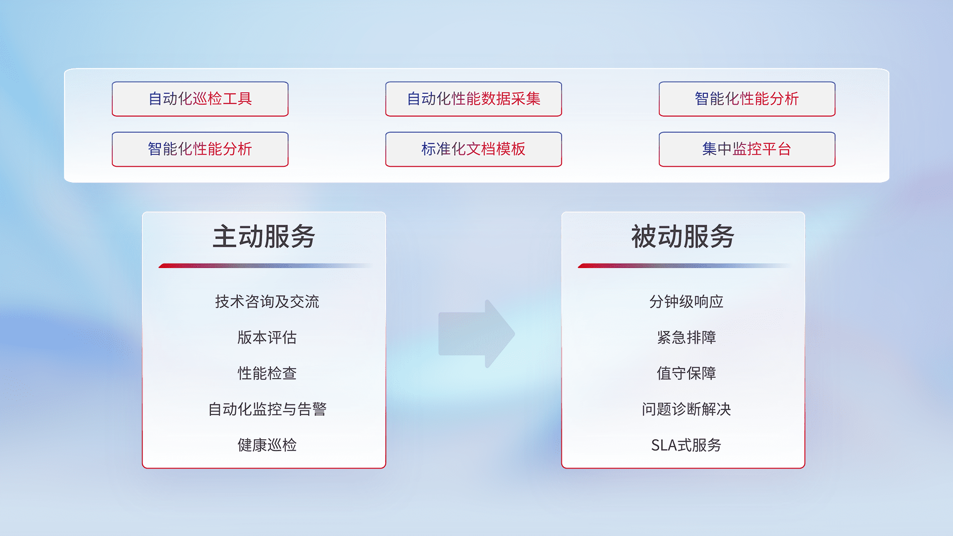 智能化工具和标准化文档,,保障服务质量,,,提供主动服务(包含技术咨询、、、、版本评估、、、、性能检查、、自动化监控与告警、、、健康巡检)和被动服务包含(分钟级响应、、、、紧急排障、、、、值守保障、、、问题诊断解决、、SLA服务)。。