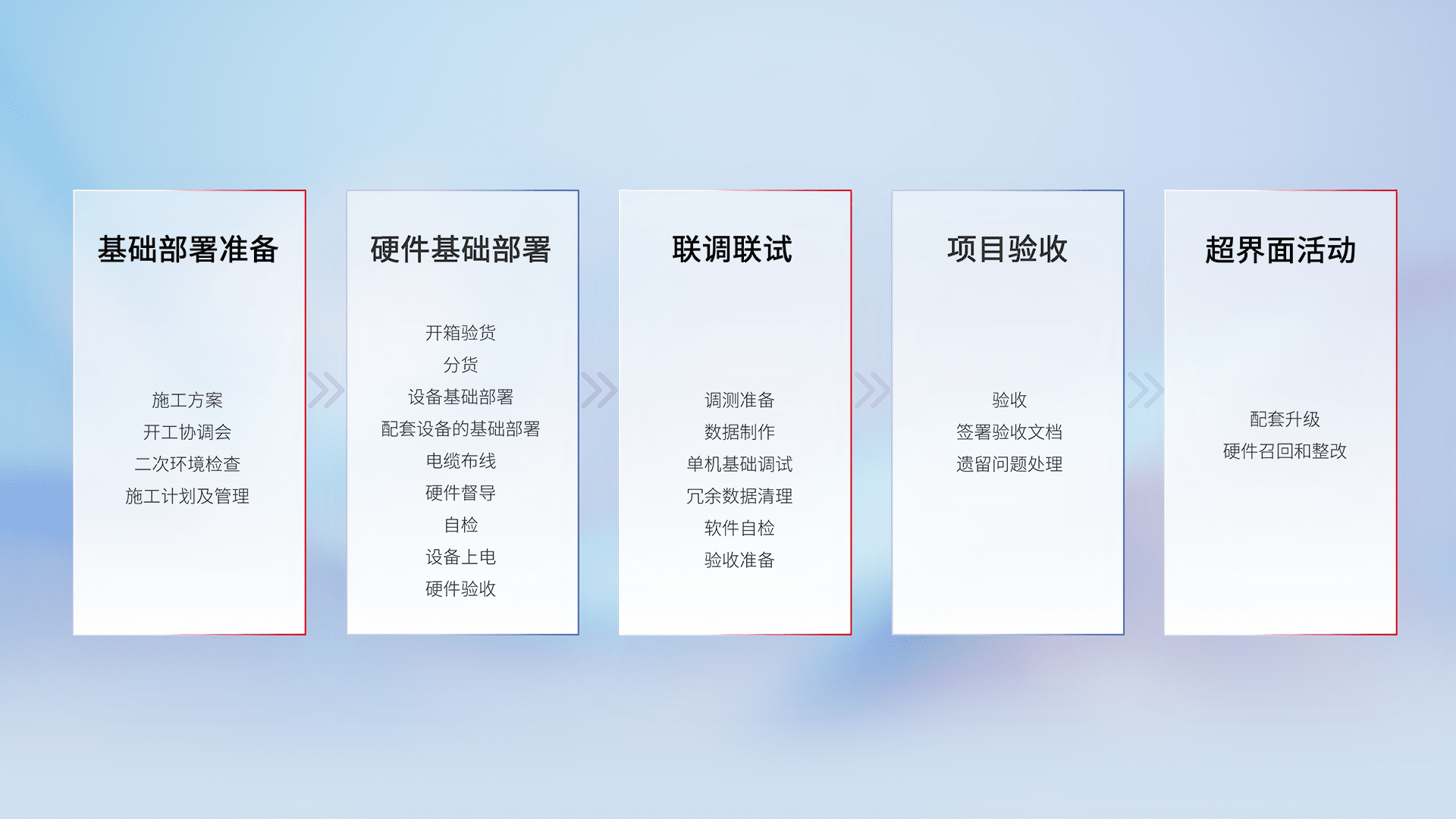 从基础部署准备、、硬件基础部署、、、联调联试、、、项目验收、、、越界面活动的全过程可追溯,,,,保证施工质量和进度。。